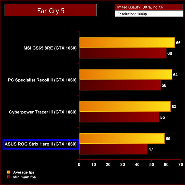 Far Cry 5 is the most recent release we tested. The gigantic open world of Hope County has plenty of beautiful scenery to test how well this laptop performs with a newer game.