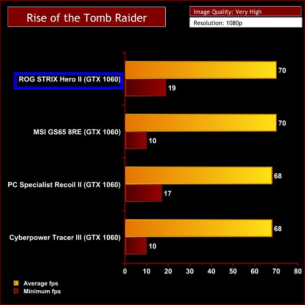 Overall, though, there really isn't much in it and the ROG Hero II can certainly play the latest games on high settings. If you want to take advantage of the 144Hz screen though, you will have to sacrifice graphics quality to bump up the frame rate any higher than 60.