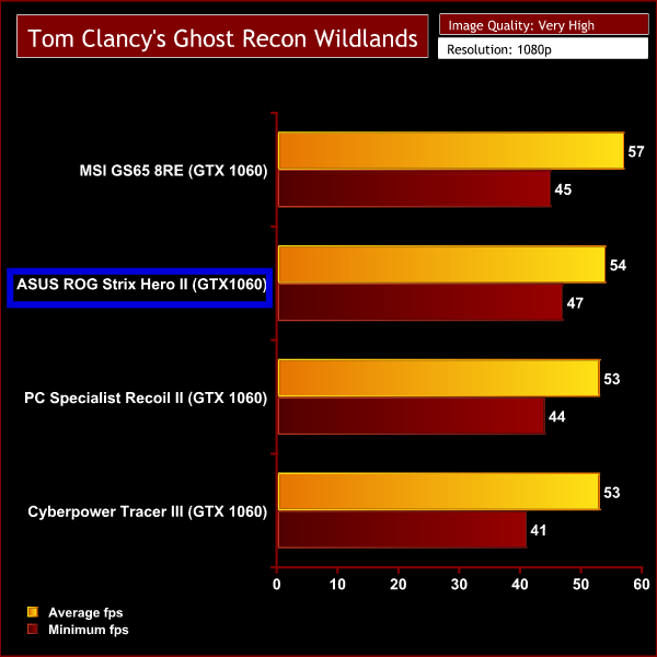 Tom Clancy’s Ghost Recon Wildlands is a game with a superb open world environment. The beautiful scenery of mountains, forests and deserts requires a lot of GPU power to render, particularly on high settings. This demanding game is perfect for testing this PC’s gaming performance.