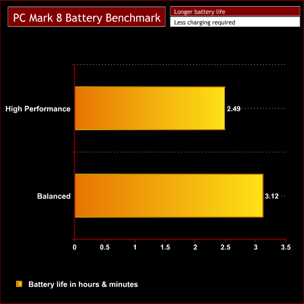Changing the power profile to ‘balanced’ will mean that the laptop won’t perform quite as well but it did increase the battery life. We got a benchmark score of 3hr12 which will equate to over 6hrs of use.