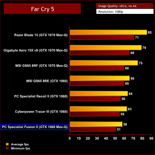 Results from our games testing see the Fusion II once again sitting in last place. This is due to the fact it is rocking the slightly less powerful Max-Q version of the GTX 1060. However the average FPS achieved is still very good when playing demanding games with their highest graphical settings.