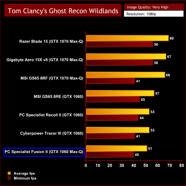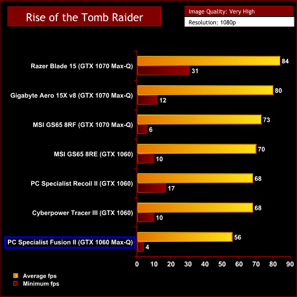 There was a minor difference of only 2fps when compared to a GTX 1060 laptop in Tom Clancy's Ghost Recon Wildlands. But the Max-Q GTX 1060 was more noticeable in Rise of the Tomb Raider with a difference of 12fps.
