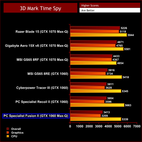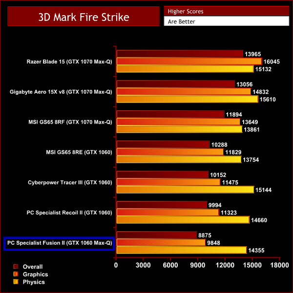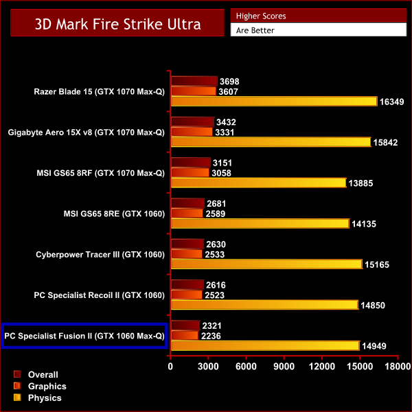 The results from our 3DMark testing see the Fusion II sitting in last place. This is no surprise as other laptops we've tested featuring the i7-8750H have come equipped with more powerful GPUs than the Max-Q version of the GTX 1060. This made clear in the results with the Fusion II lagging slightly behind with its graphics score in all 3 tests.