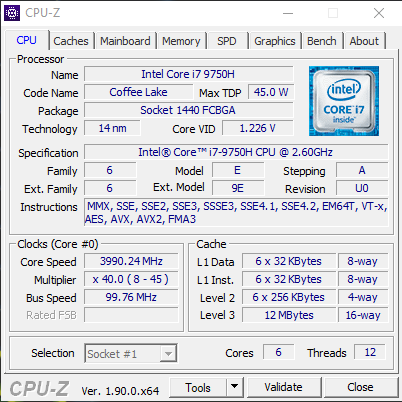 - Processor: Intel® Core™ i7 9750H (2.6 GHz up to 4.5Ghz base)