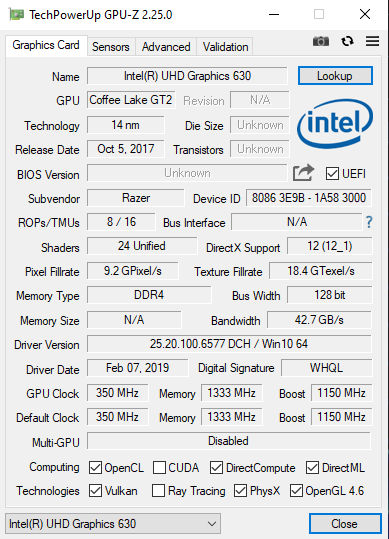 The 16GB of memory is DDR4 and runs at a speed of 2667MHz. The GPU-Z screenshots show both the Intel integrated graphics and the dedicated Nvidia RTX 2070 Max Q. The RTX 2070 Max-Q features 8GB of GDDR5 memory and has a default clock of 1080MHz and a rated boost clock of 1305MHz. However, during testing I did notice the boost clock peaked at 1890MHz and managed to maintain near to this impressive boost clock most of the time.