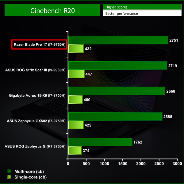 As Cinebench R20 is a reasonably new release I have less data to compare the Razer Blade 17 to. However there is no doubt that the score of 2751 is very impressive and it beats out all the laptops we have tested to date.