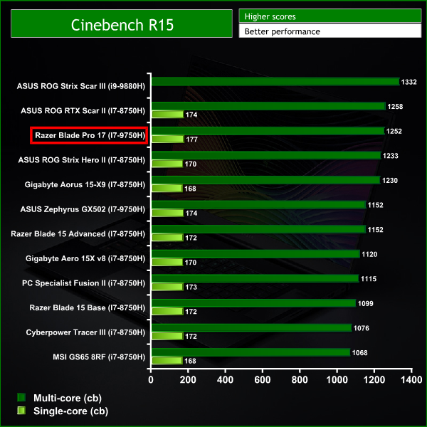 With a score of 1252 the Razer Blade 17 sits right near the top when it comes to CPU performance. There isn't much between the I7-8750H & I7-9750H CPUs as cooling and temperature are the restricting factors when it comes to the performance from both these processors. The Razer Blade 17 does however beat out the I7 8750H in the Razer Blade 15 which has a similar design. Because the Razer Blade 17 can cool effectively the processor can boost reasonably high and obtain a good score.