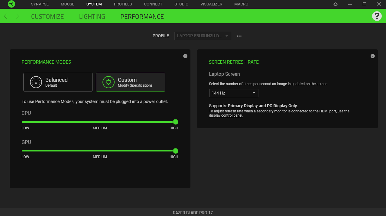 All of the testing on the Razer Blade Pro 17 was conducted with the laptop charger plugged in and the best performance battery profile selected. The Razer Blade by default is also set to the balanced profile and I went into the synapse software and adjusted the performance sliders to high on both the CPU & GPU. This allows the laptop to really stretch its legs and get the highest benchmark scores possible.
