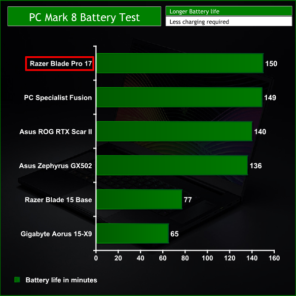 The Razer Blade Pro has an average sized battery for a gaming laptop at 70.5Whrs but the results from the PC Mark 8 test are very impressive. With a score of 2.5Hrs it sits right at the top of the chart which should translate to around 5 hours of use in the real world. From testing the Blade out I found this score to be pretty accurate.