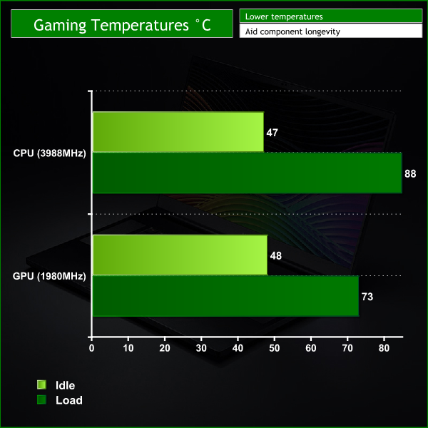 The RTX 2070 Max-Q faired very well and hit a very safe maximum of 74C. It also maintained a high boost clock speed of 1800Mhz which is impressive for a Max-Q version of this graphics chip.