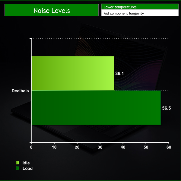 I measured noise levels using a sound meter while the laptop was idle with no programs open, and then during stress testing to get a reading with the system under 100% load.