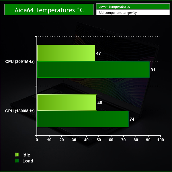 I tested the temperatures with the laptop charger plugged in. I ran AIDA 64 for 10 minutes to stress the CPU & GPU simultaneously. AIDA64 is an artificial benchmark and tests the laptops cooling to the max.