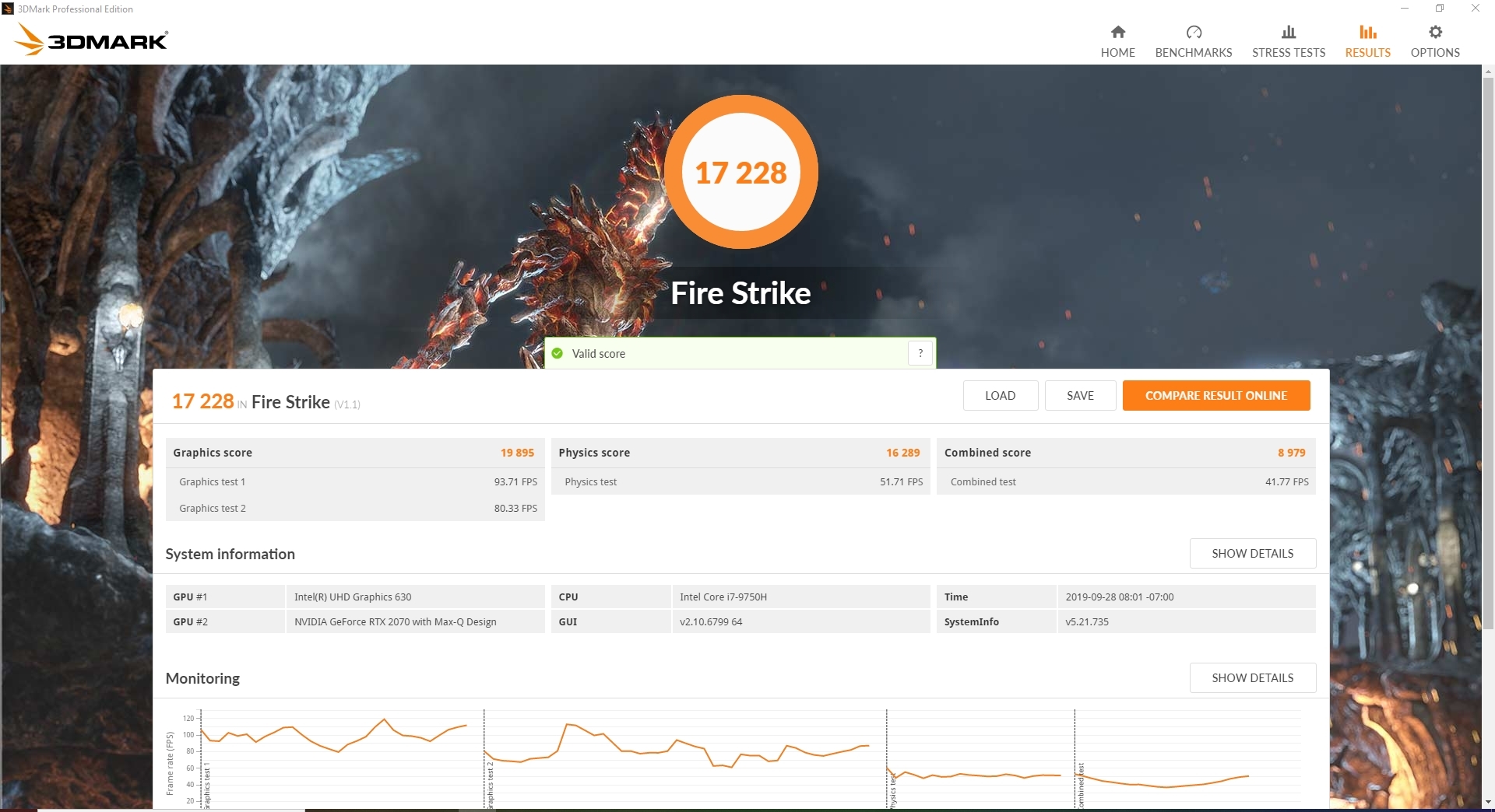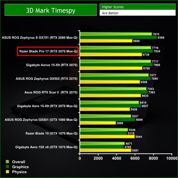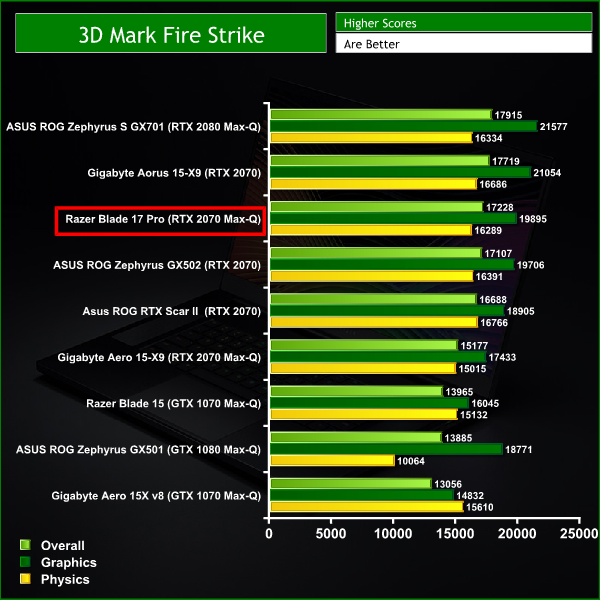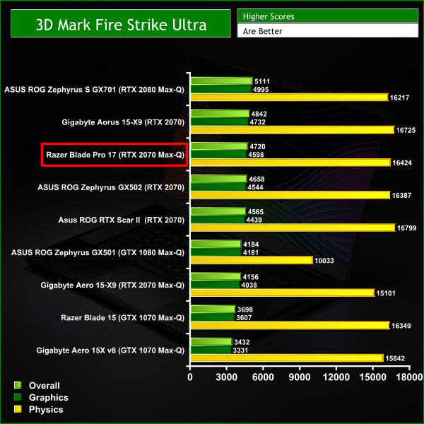 The Razer Blade Pro 17 might only have a Max-Q version of the RTX 2070 but that certainly doesn't seem to hold it back. It achieved consistently good scores across all GPU, CPU and physics tests. The Benchmark scores are very high and it happily sits near the top of the charts in all the 3DMark benchmarks battling with the Gigabyte 15-X9.