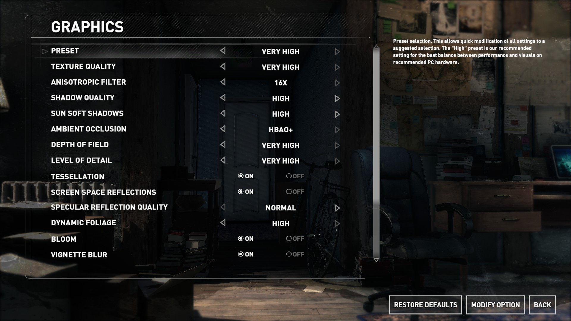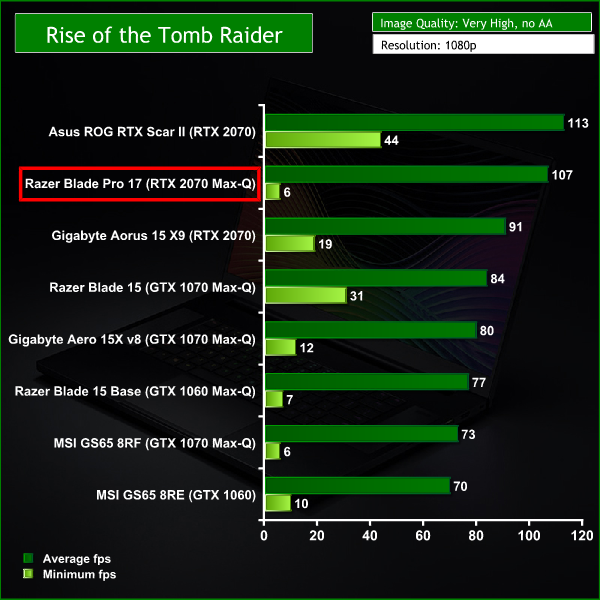 Rise of the Tomb Raider is an action adventure game with many different environments and immersive landscapes making it a useful way to test this laptop’s gaming performance. It was tested on Very high settings with AA disabled.