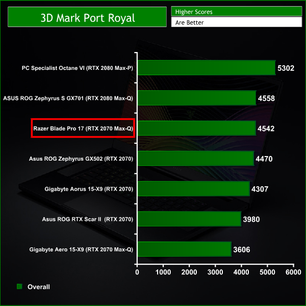 For this test, I ran the Razer Blade pro 17 through Fire Strike, Fire Strike Ultra, Time Spy and Port Royal which is the new benchmark specifically for ray tracing. In the graphs below you can see it compared against similar laptops. Even though some have similar specifications, slight variations in boost clock speeds caused by fluctuations in temperature have an impact on performance.