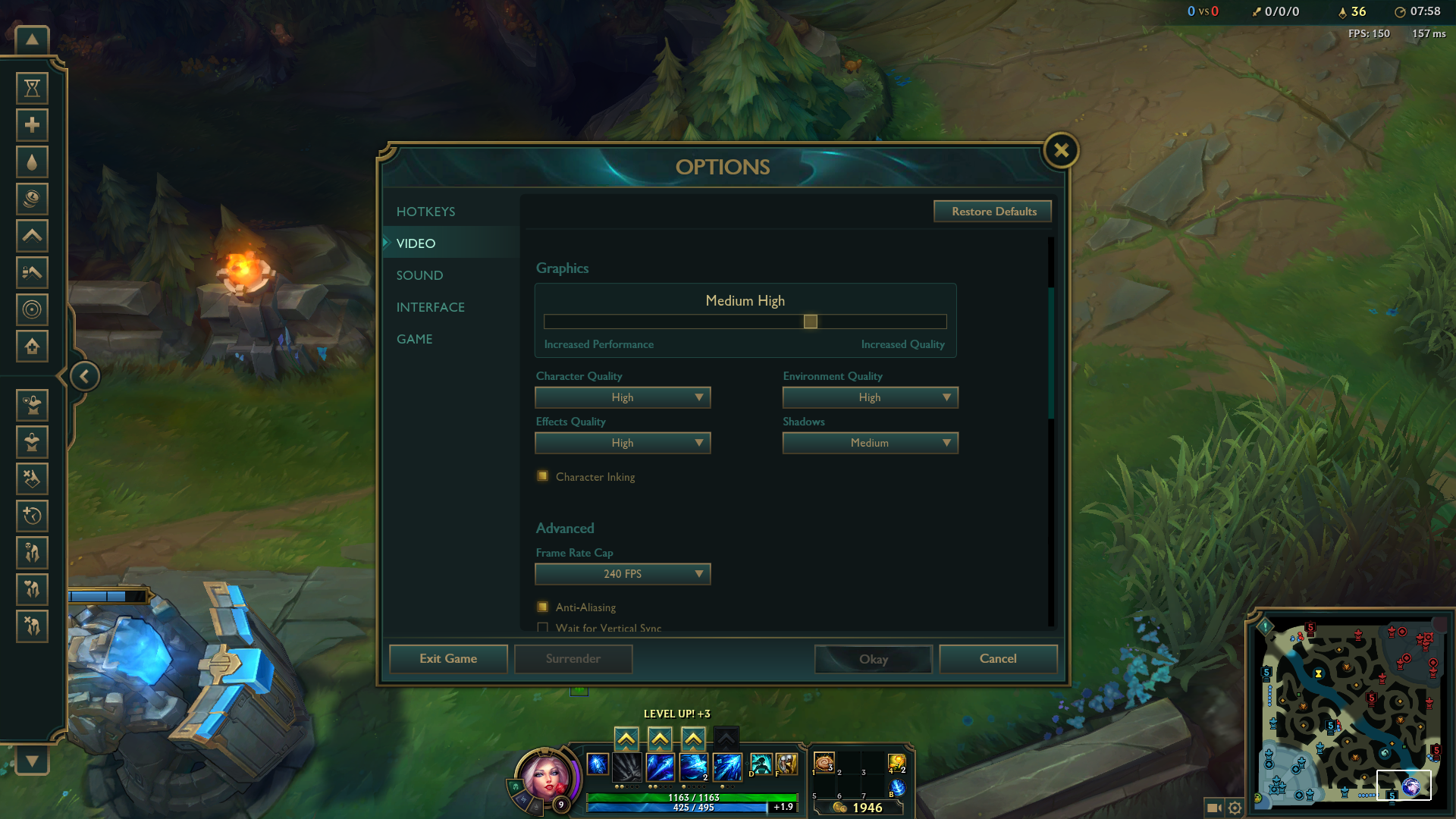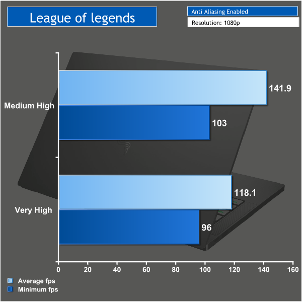 Even on very high settings League of legends was very smooth to play. The average FPS sat well above 100 and there was no danger of it dropping below 60 even during team fights.