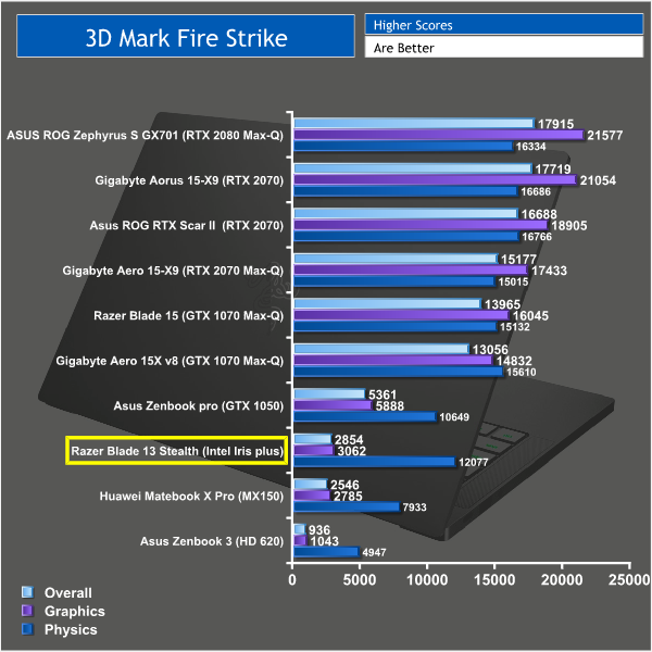 The Razer Blade Stealth achieved an overall score of 2854. It pales in comparison when taking a look at proper gaming laptops with discrete graphics, however it does beat out a couple of other ultrabooks when it comes to graphical performance. The Intel Iris Plus graphics are clearly an improvement over the old HD-series iGPUs, but even a reasonably weak GPU like the GTX 1050 is leagues ahead.