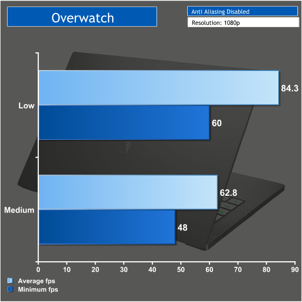 Overwatch is still very playable on this laptop at medium settings, but if you don't want to drop below 60fps you will need to drop everything to low settings. You could also drop down the resolution to squeeze out a few more fps. I'd say Overwatch is the limit on what you can happily play on this laptop and still have an enjoyable experience.