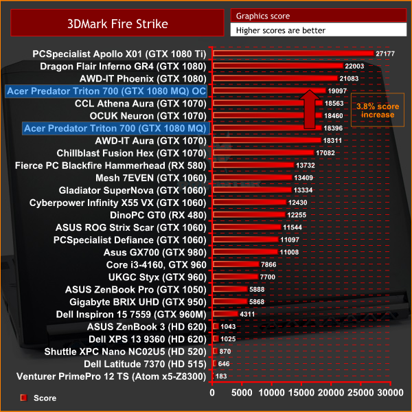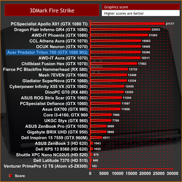 Overall performance from the i7 and GTX 1080 Max-Q is very impressive. You can see the performance difference between the Max-Q graphics chip and a desktop equivalent – around 3000 points in Fire Strike – but considering the size of the Triton 700, its performance is quite impressive nonetheless.