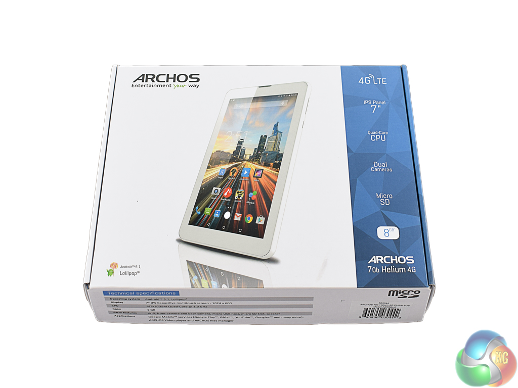 The ARCHOS 70b Helium ships in a fairly standard box, with the front showing the tablet itself and some key specs.