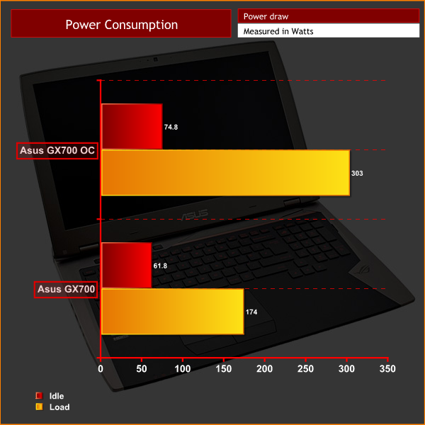 For a laptop, the GX700 draws a fair amount of power when undocked. Docked, it draws more than some gaming desktops would – suggesting the overclock and the watercooling gear requires some serious power.