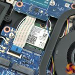 Moving on to look at the internals, if you do open up the Scar 15 it's important to note that two thin (and fragile) ribbon cables run from the motherboard to the underside panel itself, so caution is advised when removing said panel. After that, we can note the 90Whr battery as well as the two SK Hynix BC711 1TB SSDs, configured in RAID 0. There's also two 16GB DDR4 modules from Samsung, while ASUS is using Intel's AX200N WiFi 6 module.