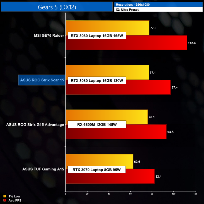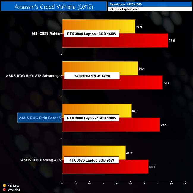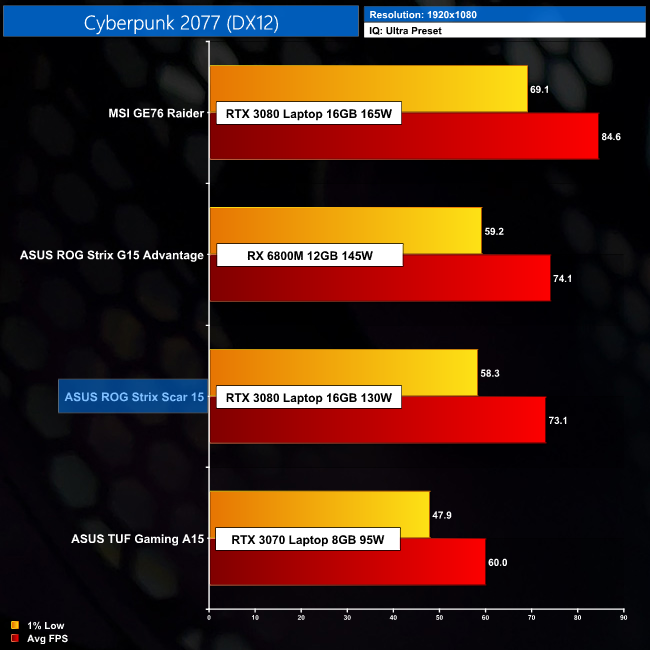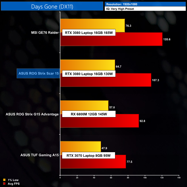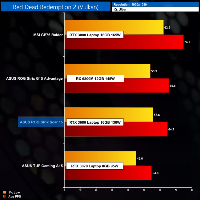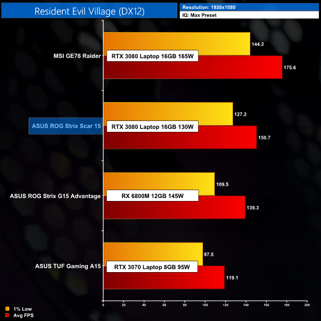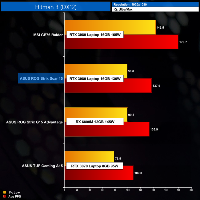 The 1080p gaming performance from the Scar 15 is pretty much neck-and-neck with that of the G15 Advantage. The RTX 3080 Laptop, in its 115W (plus 15W from Dynamic Boost) edges it ahead in some titles – like Resident Evil Village and Hitman 3 – but the RX 6800M does better in Red Dead Redemption 2 and Assassin's Creed Valhalla. Either way, the deltas are very small, so the real-world gaming performance of both machines is close enough to be called a tie.