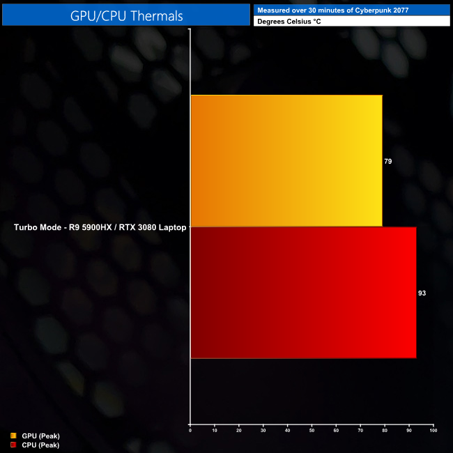 Thermally we can have no complaints from the Scar 15. The RTX 3080 Laptop peaked at 79C when using the ASUS Turbo mode, and that was with the GPU operating at around xxxxMHz. The 5900HX did run hotter, peaking at 93C, but impressively it maintained all-core clock speeds of over 4GHz during extended runs of Cinebench R23.