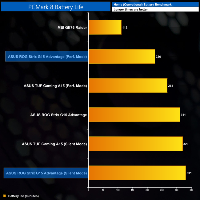 Lastly, battery life is pretty similar to the TUF Gaming A15. It didn't last quite as long using the Performance profile, but a result of over three hours is still very solid. If you switch to the Silent mode though, which operates with a lower power budget, this can be stretched to almost six hours, and bearing in mind that is six hours of constant use, the Scar offers more than enough juice to keep you going if you're out and about and need to send a few emails or surf the web.