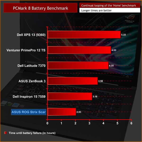 Battery life is not really a strong point for the Scar. At just over two hours in our PCMark 8 test it is decent for a gaming laptop but nothing really to write home about. Best to keep the power brick with you if you will be doing anything intensive.