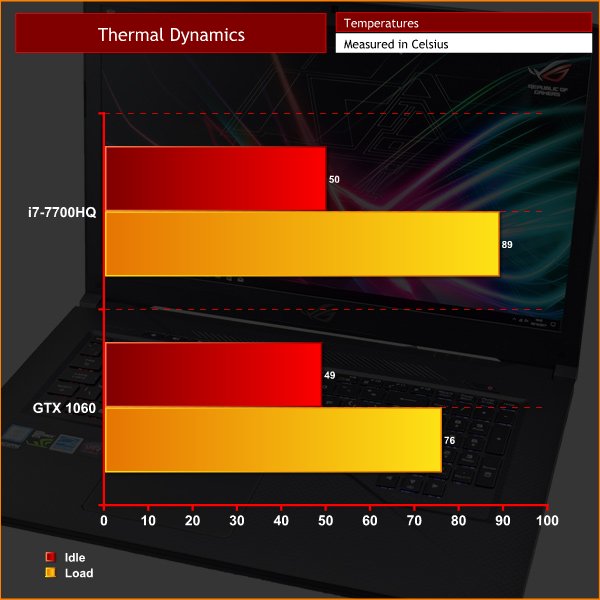 If you haven't watched the video above, we would recommend it as I have included a noise test of the laptop. The Scar is certainly a very loud device, however the benefit of that is the components do stay fairly cool – for a laptop at least. A discrete laptop GPU maxing-out at 76C is superb, even if it is the relatively low-power GTX 1060.