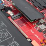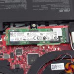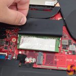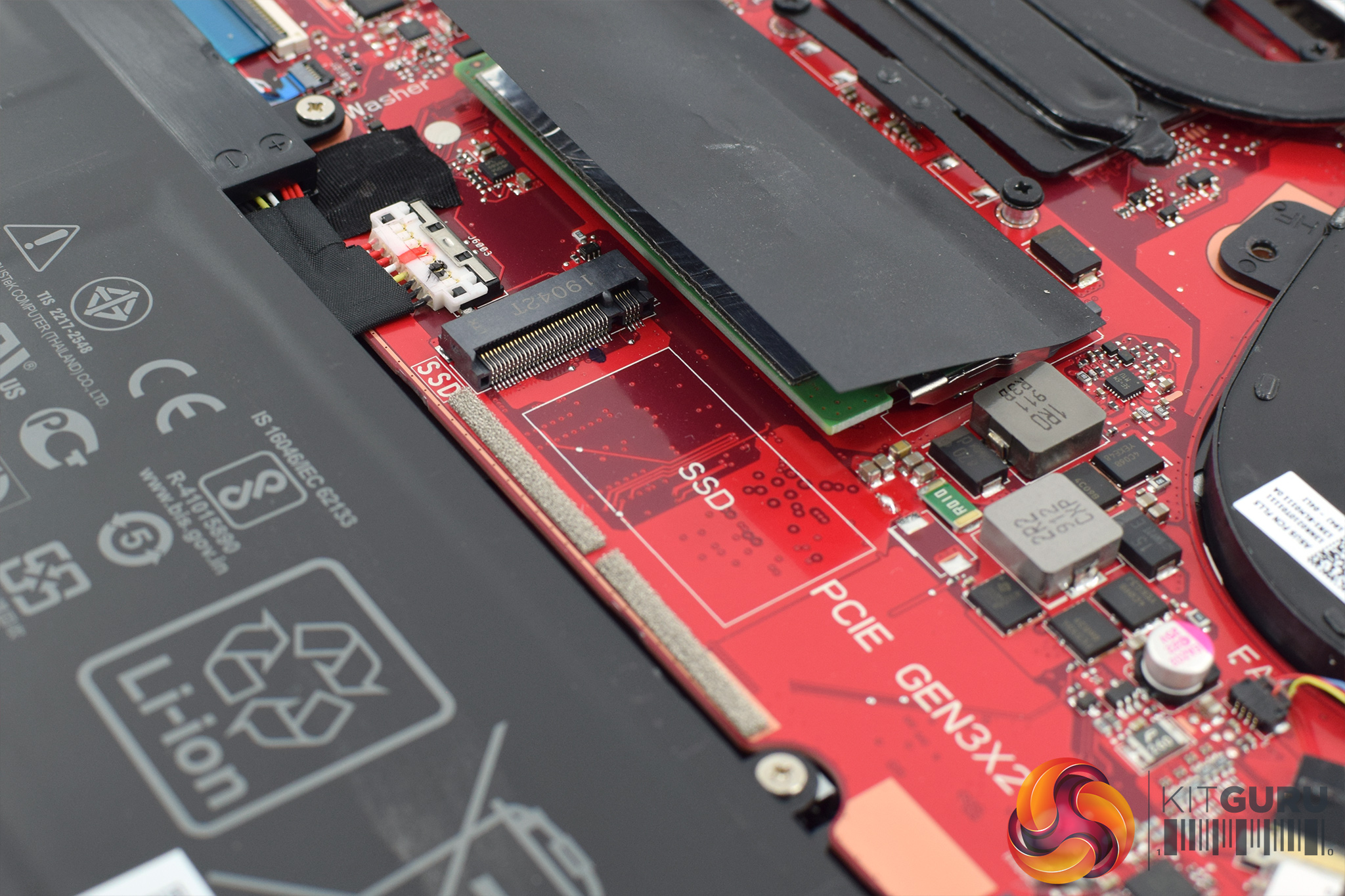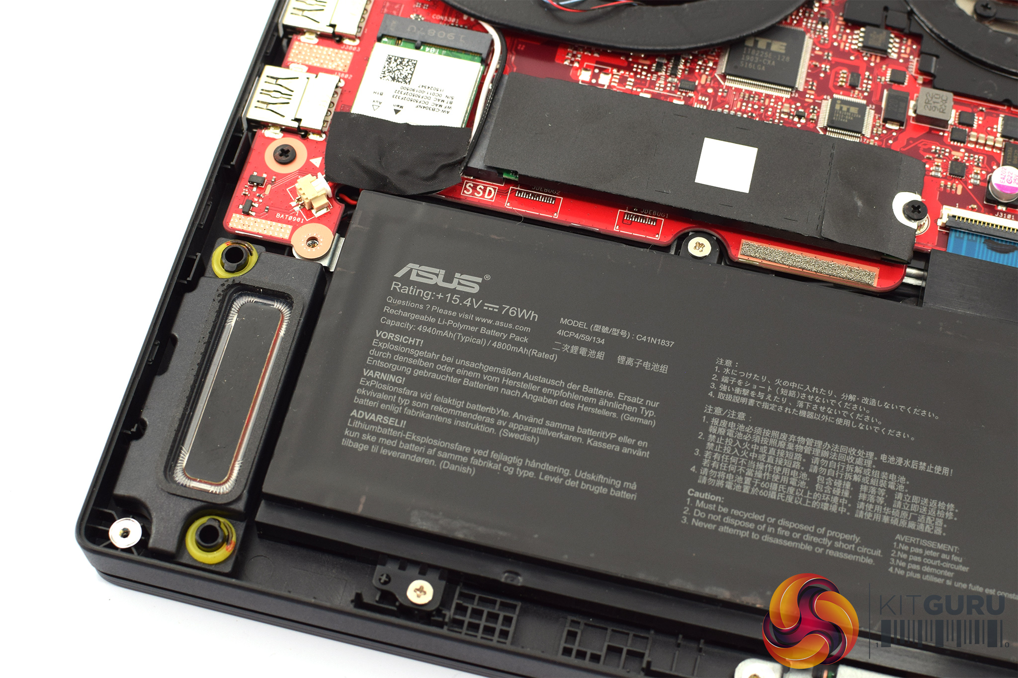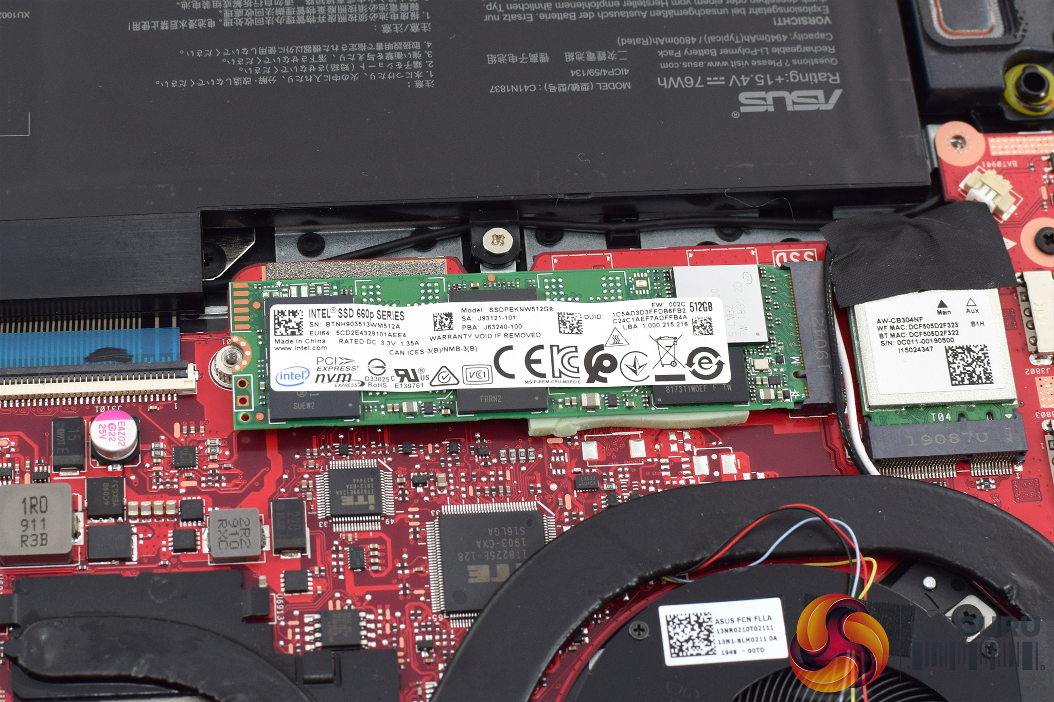 Taking off the bottom panel requires the removal of 15 Phillips-head screws, and then there's some clips holding the panel down as well. Once this is off, we get a look at the internal components and the bright red motherboard. The first thing to note is the relatively large 76Wh battery, which takes up most of the bottom section of the internals. Above that, on the left hand side, we find our only installed drive – a 512GB Intel 660p NVMe SSD. There is a spare M.2 slot to the right of this, however, which does support PCIe 3.0 SSDs, but only over x2 lanes.