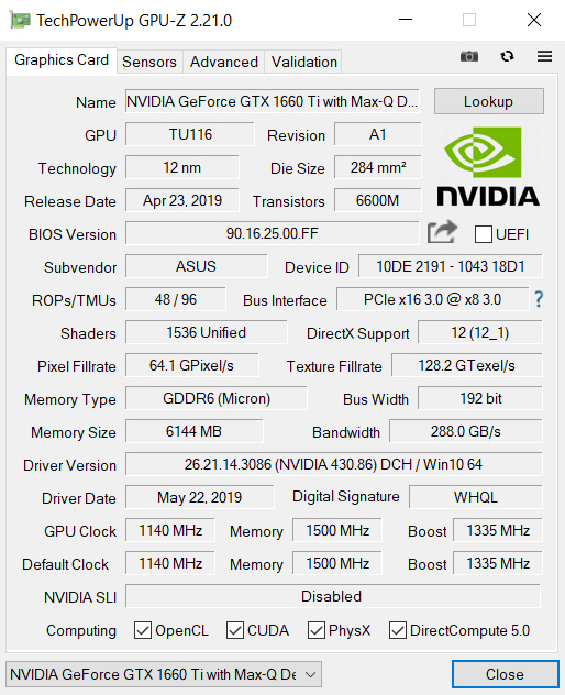 - Graphics: NVIDIA® GeForce® GTX 1660 Ti Max-Q 6GB GDDR6