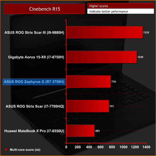 Our first test, Cinebench R15, gives a score of 776, which is not at all bad for a mobile quad-core processor. This is slightly ahead of Intel's older i7-7700HQ – also a quad-core chip – but as expected it falls well behind Intel's newer 6 and 8-core parts.