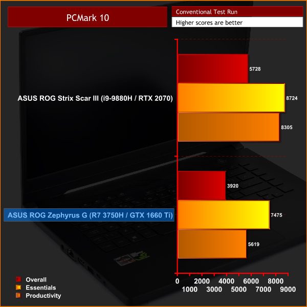 PCMark 10 is another new addition to our roster, so we only have the £2800 Strix Scar III to compare with – but even so, it performs well, especially in the Essentials benchmark, indicating a good level of performance for executing office tasks and web browsing with the machine, which ties into its portable nature as you may want to use it for gaming at home, but also take it to work or university for general use.