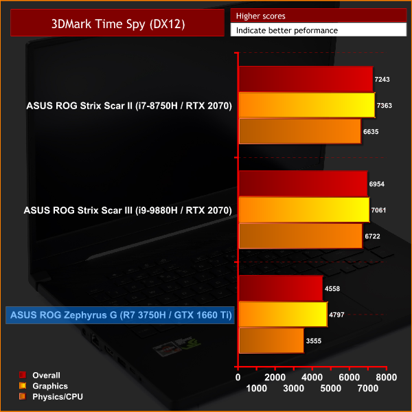 The Zephyrus G posts healthy benchmark scores in both the Fire Strike (1080p DX11) and Time Spy (1440p DX12) benchmarks. Looking first at the graphics score from Fire Strike, the machine posted a result of 12698. Compared to a desktop GTX 1660 Ti – like this Gigabyte OC 6G model – this is around 3400 fewer points, though we have to remember this is both a Max-Q chip and it is paired with a mobile processor. Even so, it's still a decent score considering both those limitations.