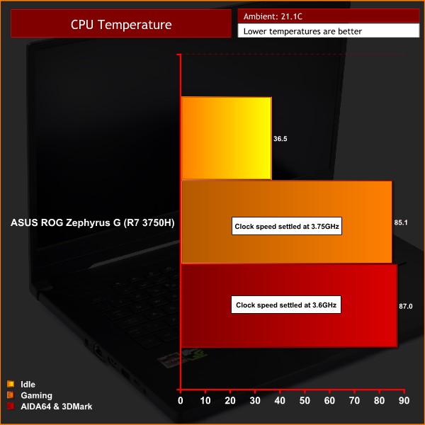 Starting with CPU performance, the 3750H does run quite warm in the Zephyrus G. That said, 87C was the absolute hottest temperature we saw when stressing the CPU in AIDA64, while simultaneously loading the GPU with looped runs of 3DMark Fire Strike. Even in that worst-case scenario – with CPU and GPU load at 100% – the 3750H maintained 3.6GHz across all four cores, which is nowhere close to thermal throttling. Things are even better when gaming, as we saw CPU clock speeds settle at the 3.75GHz mark when playing Shadow of the Tomb Raider.