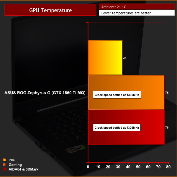 GPU temperatures are even better, with the 1660 Ti Max-Q peaking at 76C whether we were gaming or running our AIDA64/3DMark stress test. We did notice the core clock stayed higher when just gaming, however, with frequencies at and around the 1400MHz mark when in Shadow of the Tomb Raider.