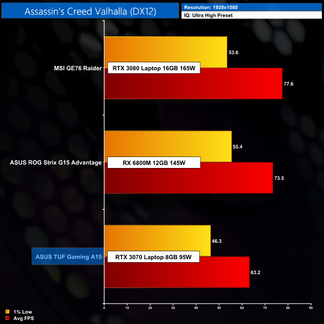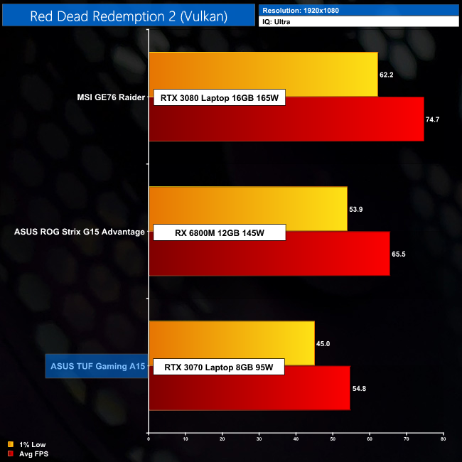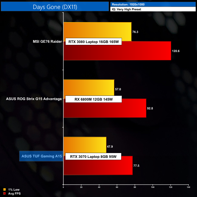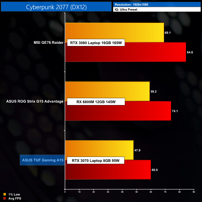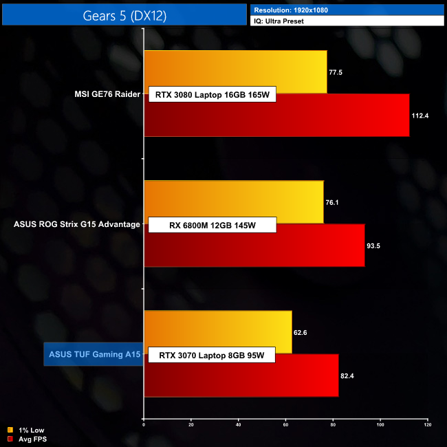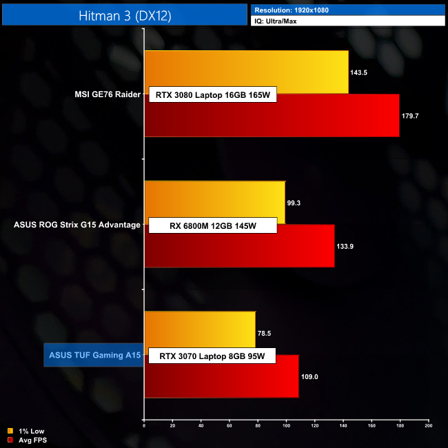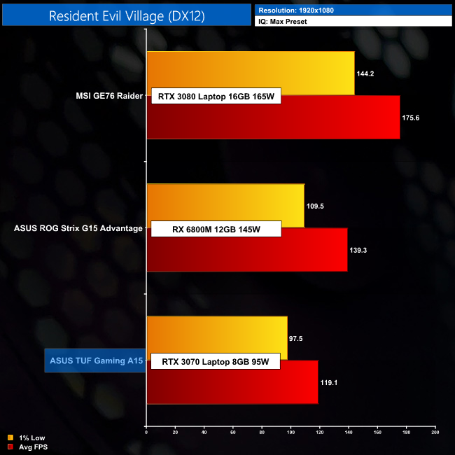As we'd expect, the TUF Gaming A15 can't quite keep up with the Strix G15 Advantage, though it isn't far off in the likes of Gears 5 and Resident Evil Village. We are still getting a very playable experience across the board, however, hitting 60FPS (or just below) in the likes of Cyberpunk 2077, while less demanding titles like Hitman 3 and the aforementioned Resident Evil Village see average frame rates in excess of 100FPS.