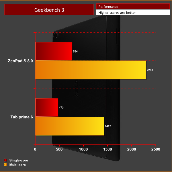 The benchmark scores do not reflect the everyday performance quite as well as they should, but they are a still impressive. In Geekbench 3, the ZenPad S 8.0 scored 764 for single-core performance and 2293 for its multi-core performance. This is far superior to the Vodafone Tab Prime 6, powered by a Snapdragon 410, which scored 473 and 1425 respectively.
