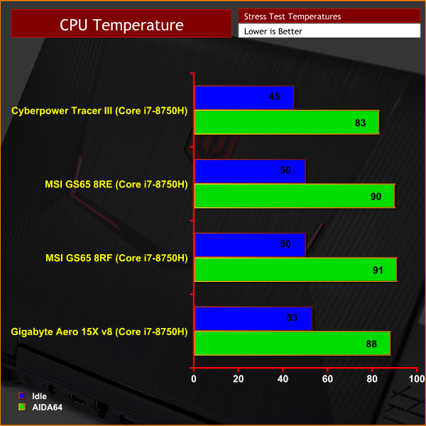 As mentioned on the previous page, the i7-8750H used in the Tracer III demonstrated some very odd behaviour while being stressed. The GS65, for instance, hit 2.8GHz across all cores when stressed in AIDA64, which isn't a fabulously high clock-speed, but it is at least consistent. With the Tracer III, there seemed to be no rhyme or reason to the behaviour of the CPU – all six of the cores were bouncing around between 2.5GHz up to 3.9GHz.