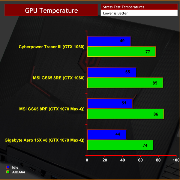 As for the GPU temperature, 77C is another impressive result, although as mentioned, the GTX 1060 in the Tracer III did not run as fast as the chip in the GS65 which again explains the lower temperature reading.