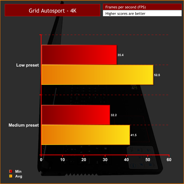 Running the ‘low' and ‘medium' presets at 4K are as high the settings will go before FPS drops below 30. Again – you are not going to game at 4K with the Inspiron 15 7559, higher settings at 1080p are simply more playable and attractive.