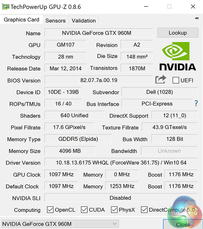 The i7 has Intel HD 530 integrated graphics, while obviously the GTX 960M is the discrete graphics chip we are interested in. It is fabricated from a 28nm process, and features 16 ROPs, 40 TMUs and 640 CUDA cores. It also has 4GB of VRAM clocked at 1253MHz.