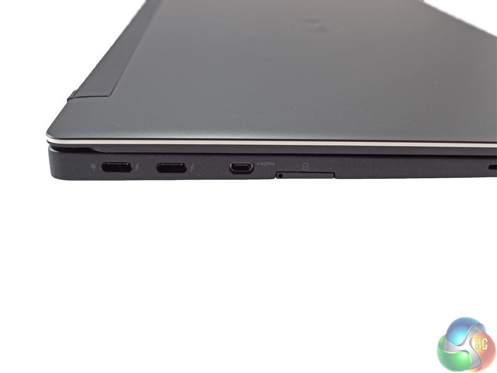 Here we get a look at the connectivity ports on the Latitude 7370. The left-side edge features two Thunderbolt (Type C) ports, with one designated as the charging port. Next to the Thunderbolt ports is one micro HDMI port and a micro SIM card slot for 3G connectivity on-the-go.