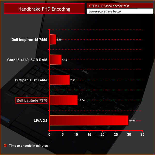 It is a similar situation here. The Latitude 7370 comes in well above the LIVA X2, but even the Broadwell-U Core i3 found in PCSpecialist's Lafite is nearly 3 minutes faster. The Core m5-6Y57 is clearly no powerhouse – but I think we already knew that.