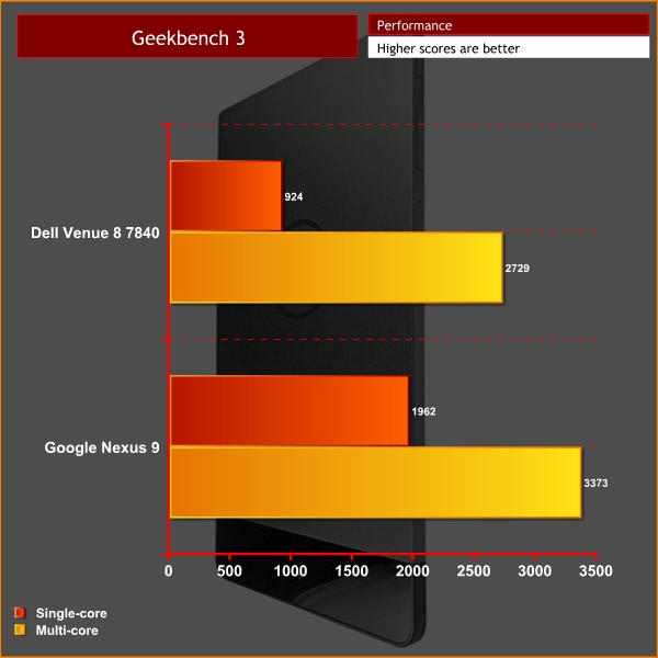 In GeekBench 3, the Venue 8 scored 924 for single-core performance, and a tasty 2729 for multi-core performance. This is just behind the Nexus 9, which scored 1962 and 3373, respectively. It is worth remembering, however, the Nexus uses the Tegra K1 chip – which utilises actual Kepler GPU architecture, so the Z3580 is not going to be quite at the same level.