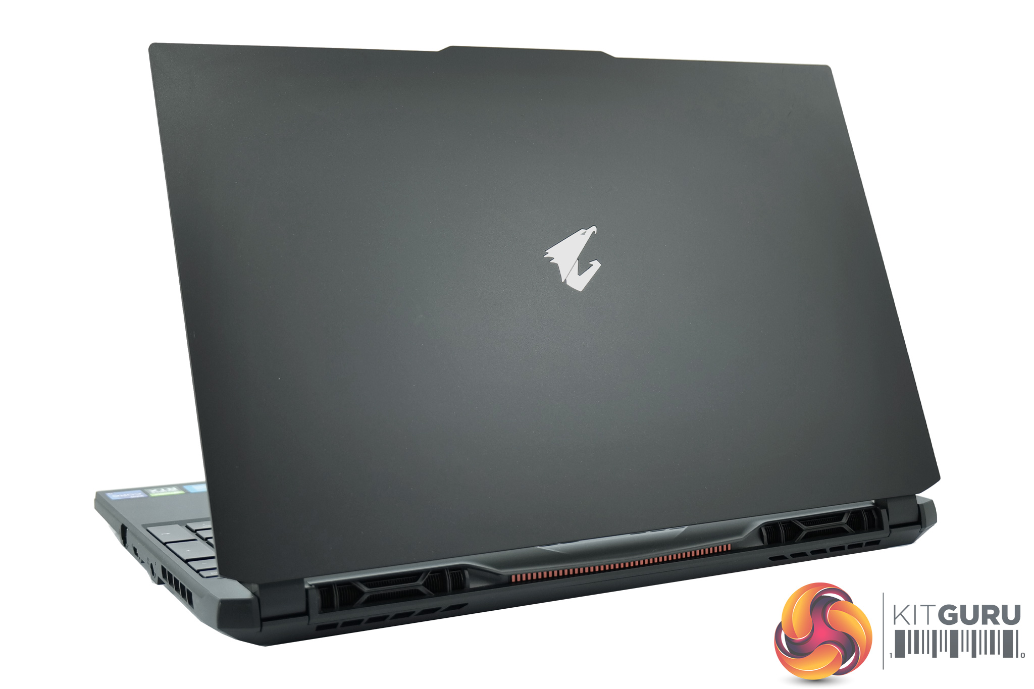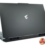 Starting with a look at the design of the Aorus 15, while it is recognisable as a gaming laptop, I wouldn't say it was an overly aggressive design. The chassis is almost entirely black, with the lid left almost completely bare, with just the Aorus logo to add a bit of gamer-y flair. There is a splash of orange on the rear of the screen hinge, but otherwise this is a fairly subdued design. It's also relatively slender for a gaming machine, coming in at 27mm thick and weighing 2.4 KG.