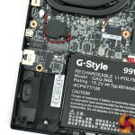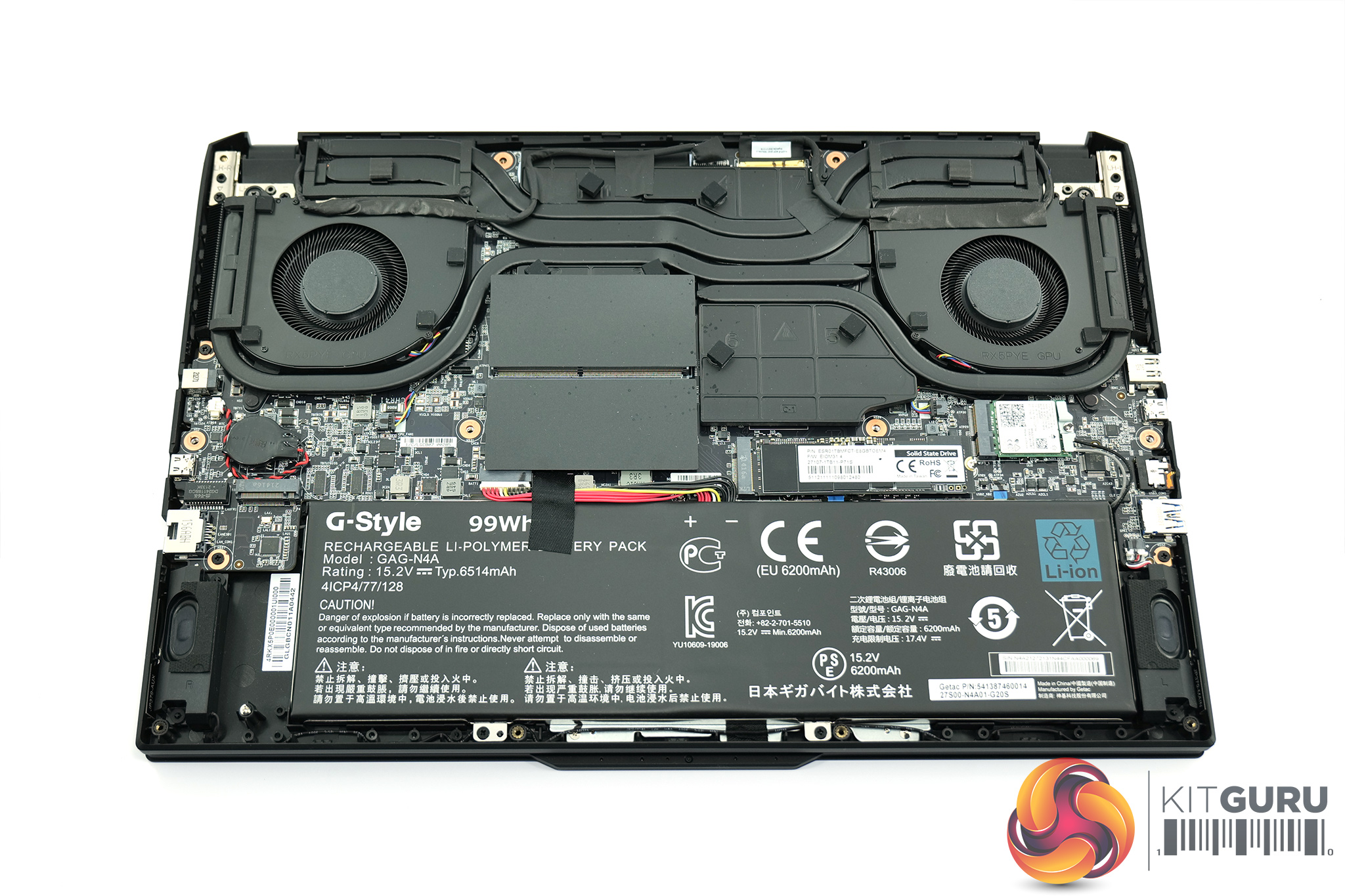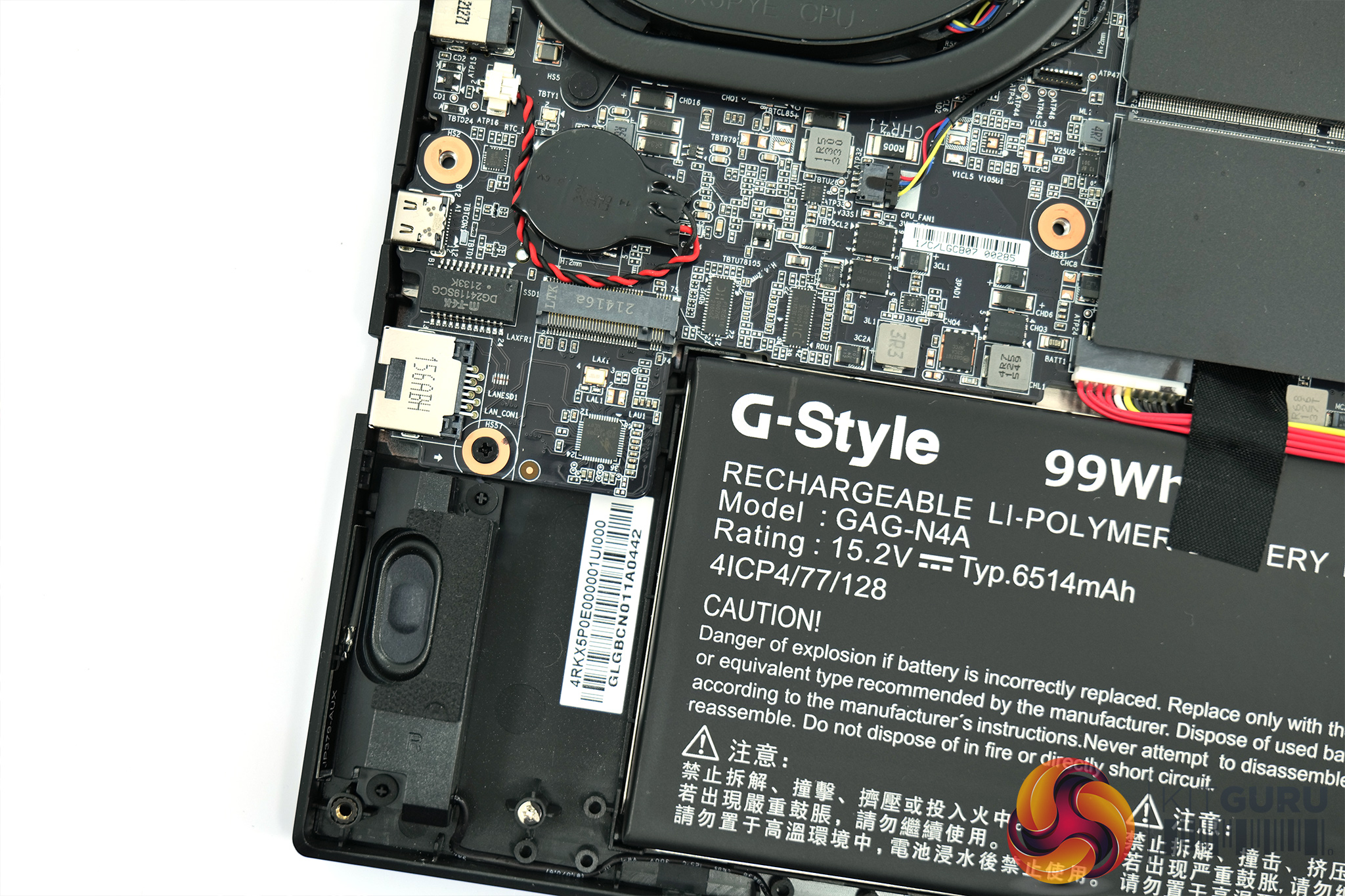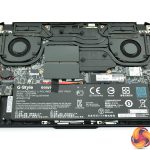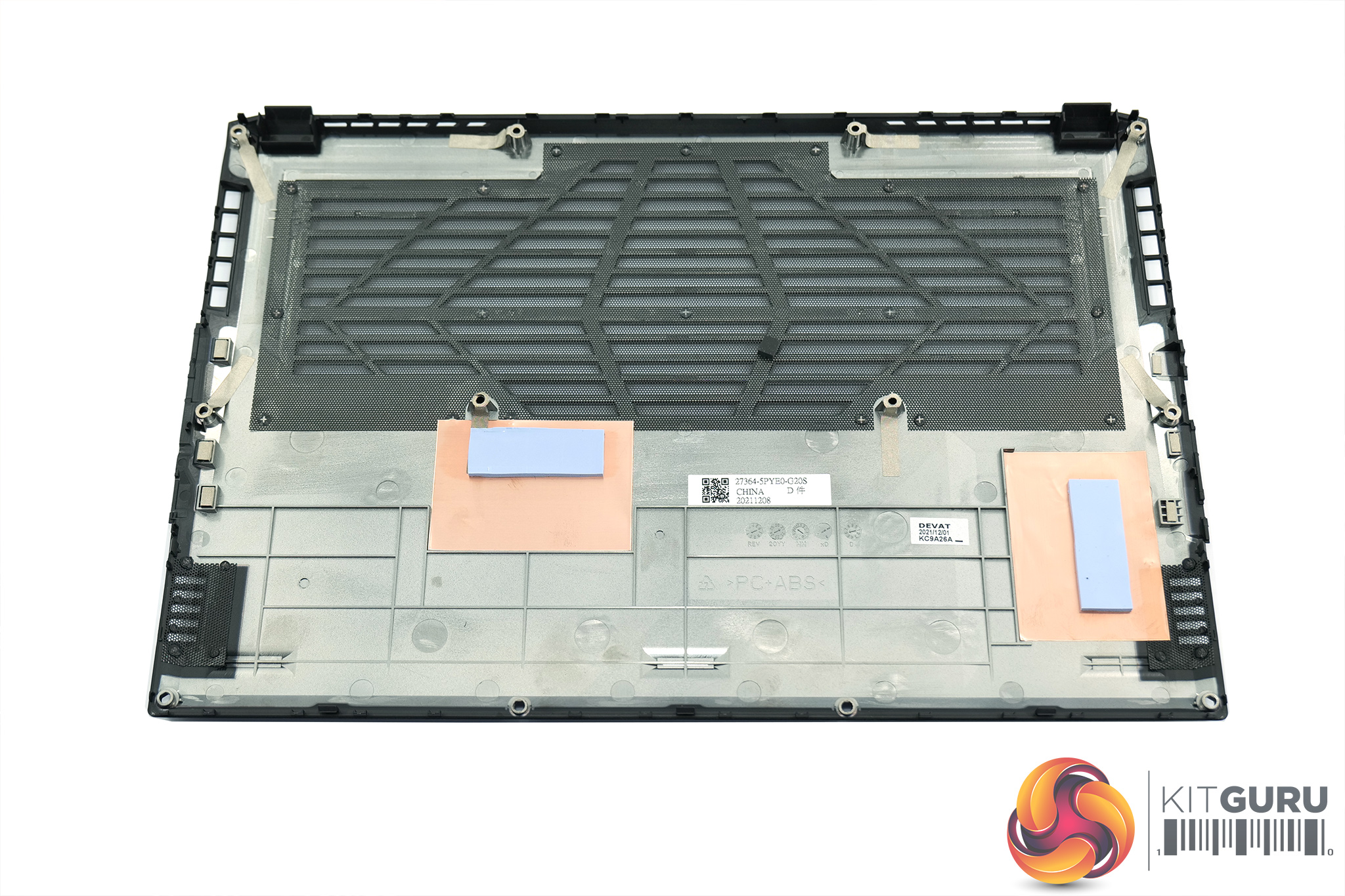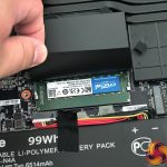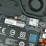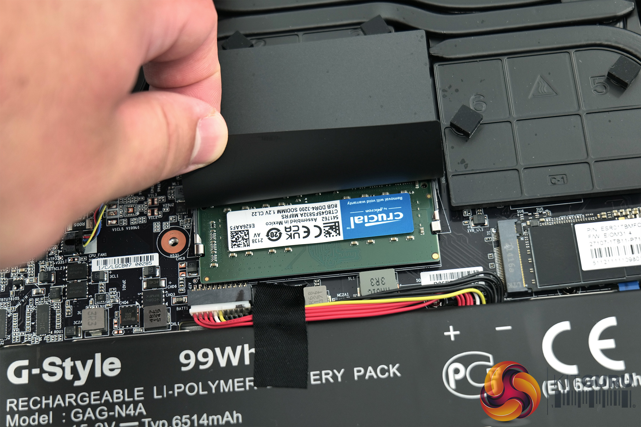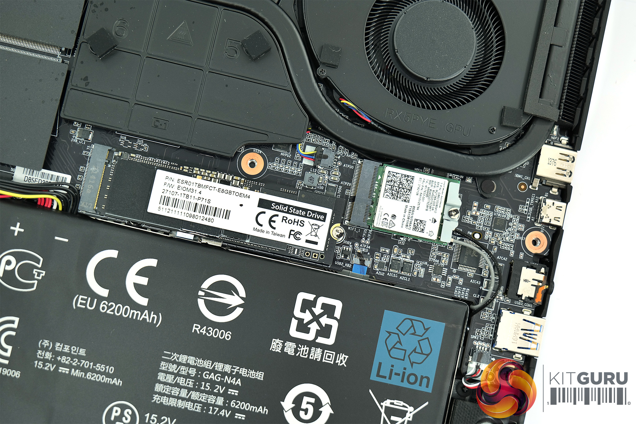 As for the internals, here things are fairly standard for a gaming laptop in 2022. First off we can see the large 99Whr battery, while on the right side, we can note a 1TB M.2 NVMe SSD and the Intel AX210 WiFi 6E M.2 chip. 1TB of storage isn't a ton, but there is a spare PCIe 4.0 M.2 slot to the left of the battery. We can also note two SODIMM slots, both occupied by 8GB DDRR4 modules from Crucial, for 16GB total. This is of course upgradeable, but as both slots are occupied you'd be left with the original modules if you did swap in new 16GB sticks.