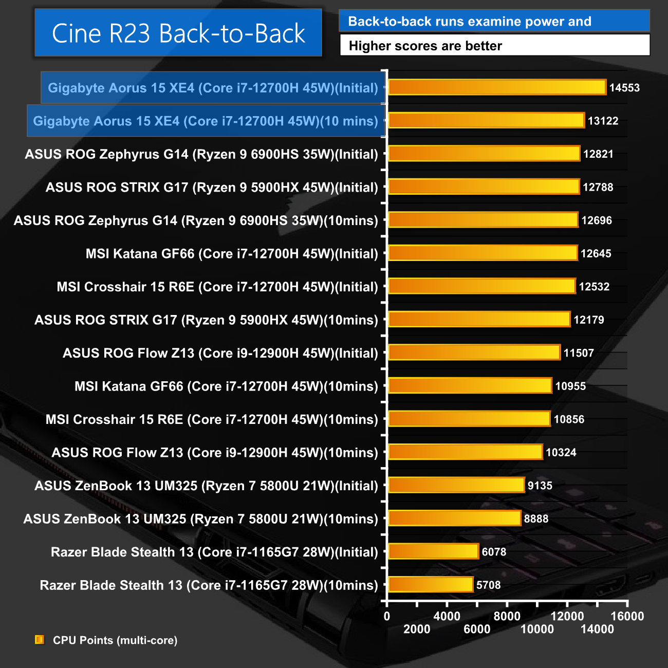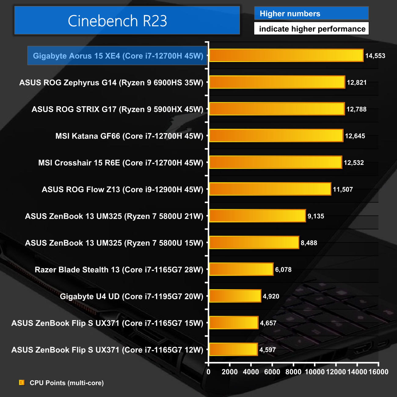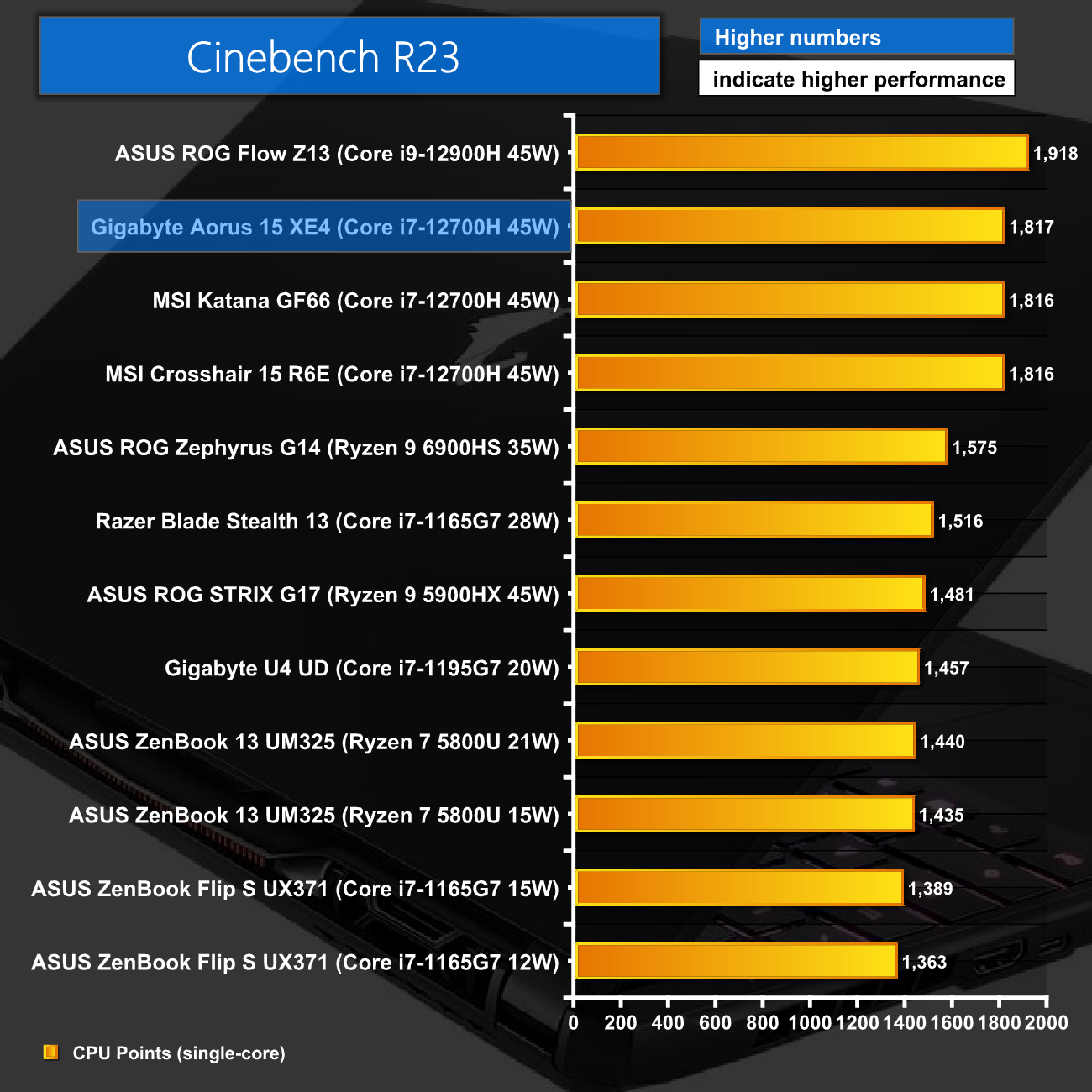 Cinebench R23 multi-core performance is very strong from the Aorus 15. Thanks to the relatively high sustained clock speed, it out-performs the likes of the MSI Crosshair 15 R6E by about 16%, as the MSI laptop managed to operate it's P-cores at 2.2GHz, compared to 2.7GHz for the Aorus 15.